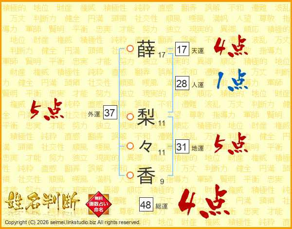 薛(17画) 梨(11画)々(11画)香(9画)