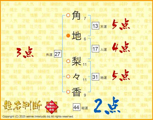 角(7画)地(6画)  梨(11画)々(11画)香(9画)