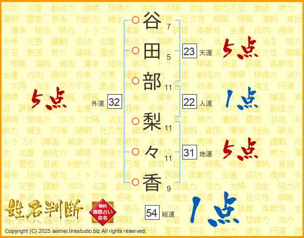 谷(7画)田(5画)部(11画) 梨(11画)々(11画)香(9画)