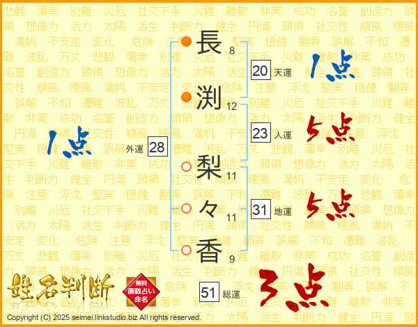 長(8画)渕(12画) 梨(11画)々(11画)香(9画)