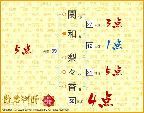 関(19画)和(8画) 梨(11画)々(11画)香(9画)