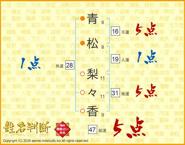 青(8画)松(8画) 梨(11画)々(11画)香(9画)