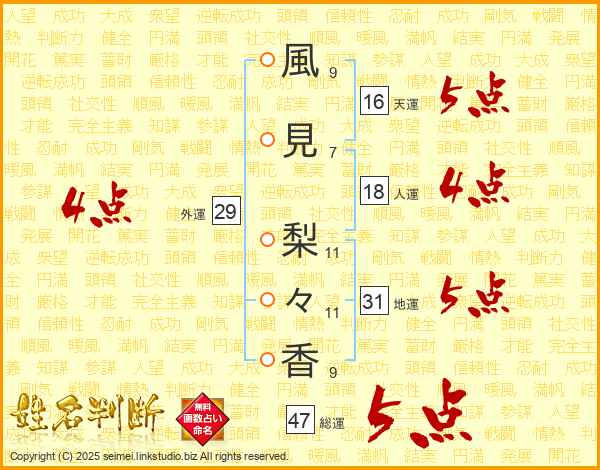 風(9画)見(7画) 梨(11画)々(11画)香(9画)