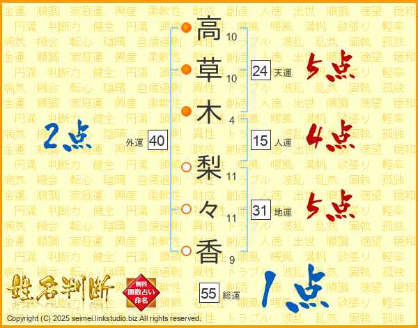 高(10画)草(10画)木(4画) 梨(11画)々(11画)香(9画)