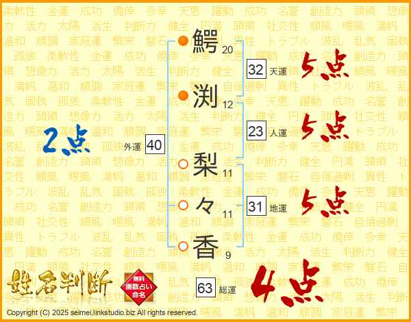 鰐(20画)渕(12画) 梨(11画)々(11画)香(9画)