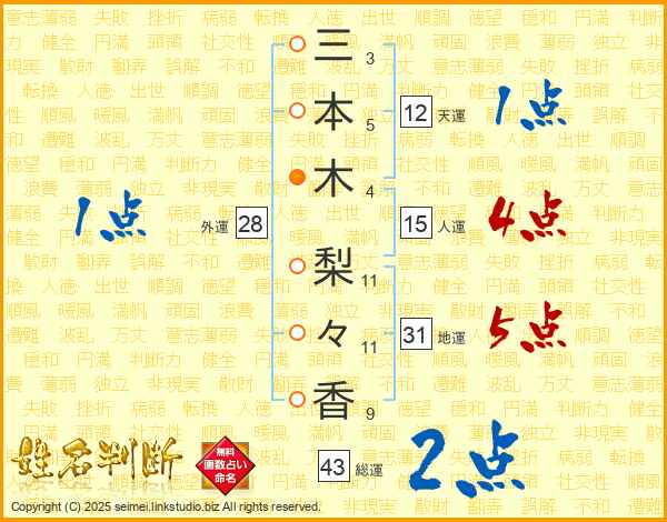 三(3画)本(5画)木(4画)  梨(11画)々(11画)香(9画)