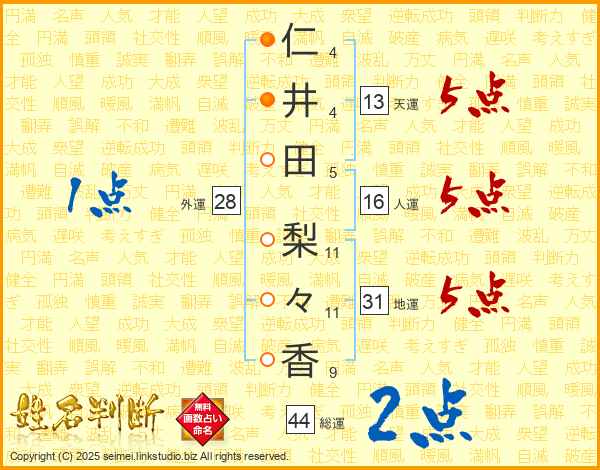 仁(4画)井(4画)田(5画) 梨(11画)々(11画)香(9画)