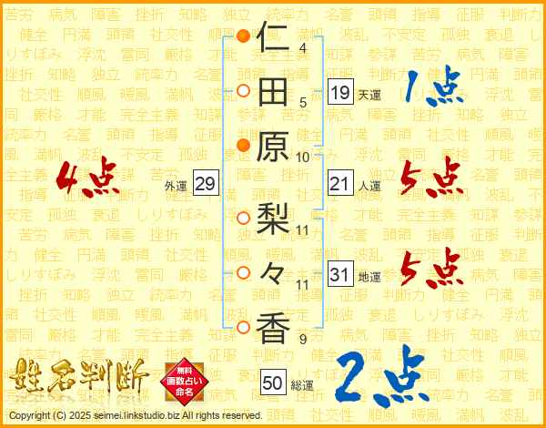 仁(4画)田(5画)原(10画) 梨(11画)々(11画)香(9画)