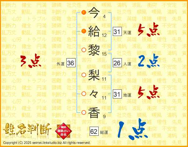 今(4画)給(12画)黎(15画) 梨(11画)々(11画)香(9画)