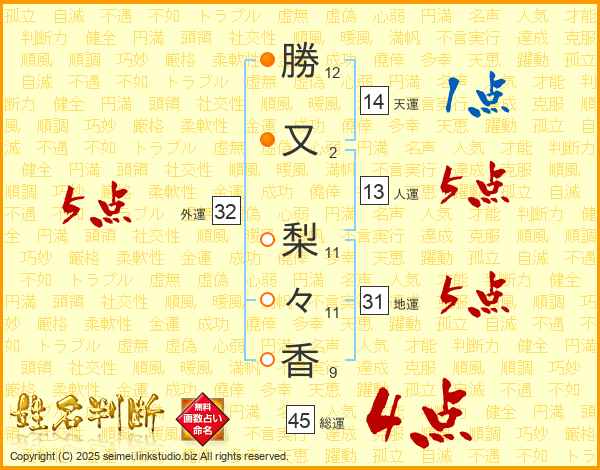 勝(12画)又(2画) 梨(11画)々(11画)香(9画)