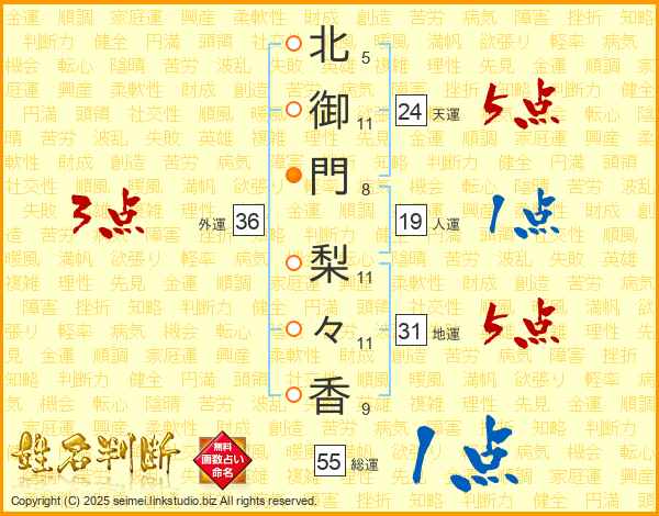 北(5画)御(11画)門(8画) 梨(11画)々(11画)香(9画)