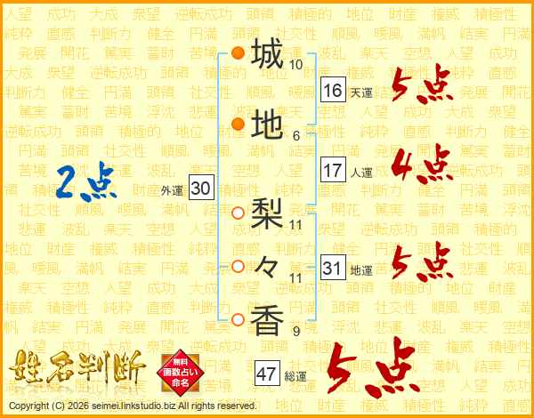 城(10画)地(6画) 梨(11画)々(11画)香(9画)