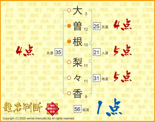 大(3画)曽(12画)根(10画) 梨(11画)々(11画)香(9画)