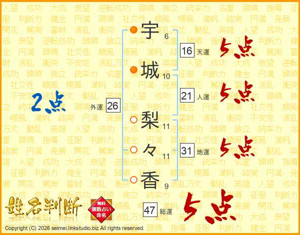 宇(6画)城(10画) 梨(11画)々(11画)香(9画)