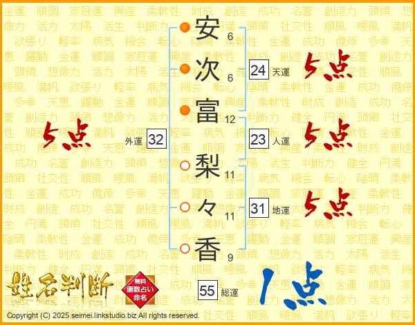 安(6画)次(6画)富(12画) 梨(11画)々(11画)香(9画)