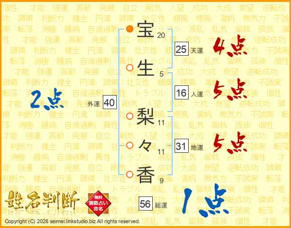 宝(20画)生(5画) 梨(11画)々(11画)香(9画)