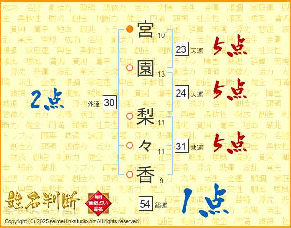 宮(10画)園(13画) 梨(11画)々(11画)香(9画)