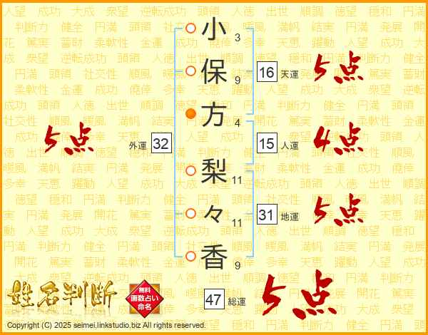 小(3画)保(9画)方(4画) 梨(11画)々(11画)香(9画)