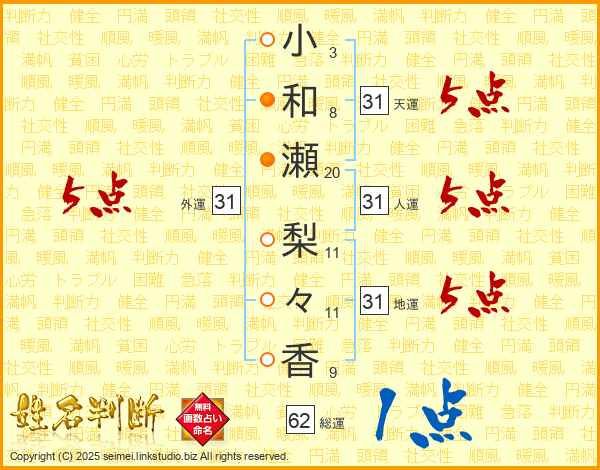 小(3画)和(8画)瀬(20画)  梨(11画)々(11画)香(9画)