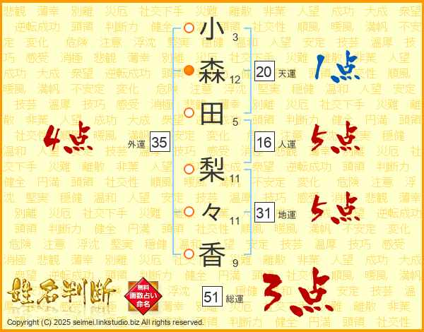 小(3画)森(12画)田(5画) 梨(11画)々(11画)香(9画)