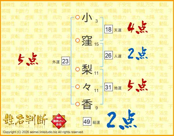 小(3画)窪(15画) 梨(11画)々(11画)香(9画)