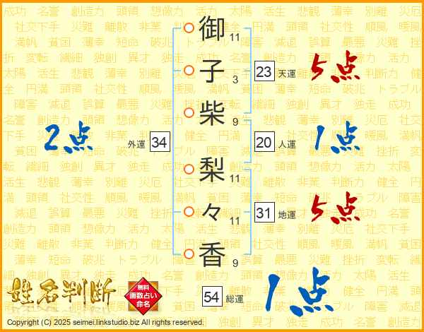 御(11画)子(3画)柴(9画) 梨(11画)々(11画)香(9画)