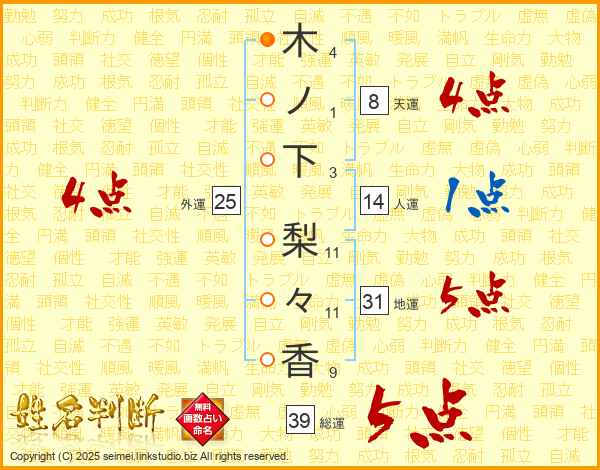 木(4画)ノ(1画)下(3画) 梨(11画)々(11画)香(9画)