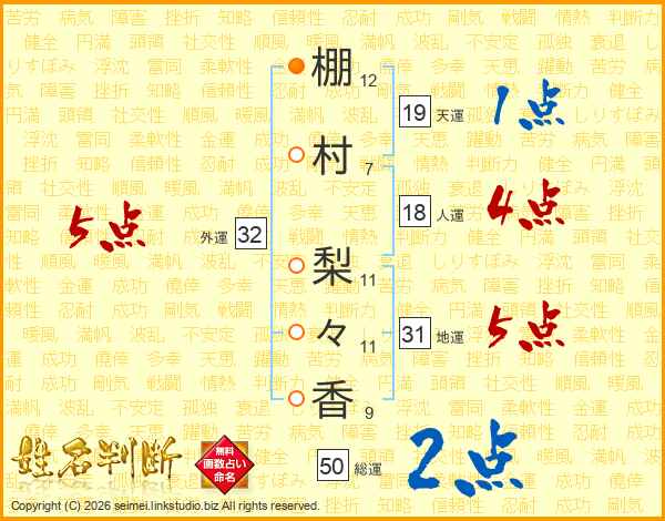 棚(12画)村(7画) 梨(11画)々(11画)香(9画)