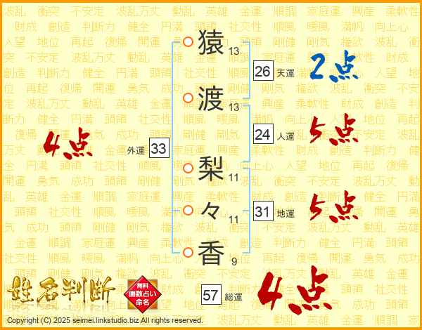 猿(13画)渡(13画)  梨(11画)々(11画)香(9画)