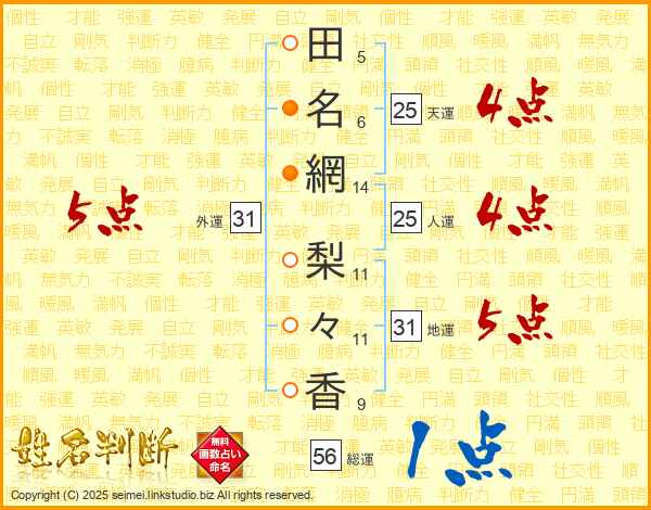 田(5画)名(6画)網(14画) 梨(11画)々(11画)香(9画)