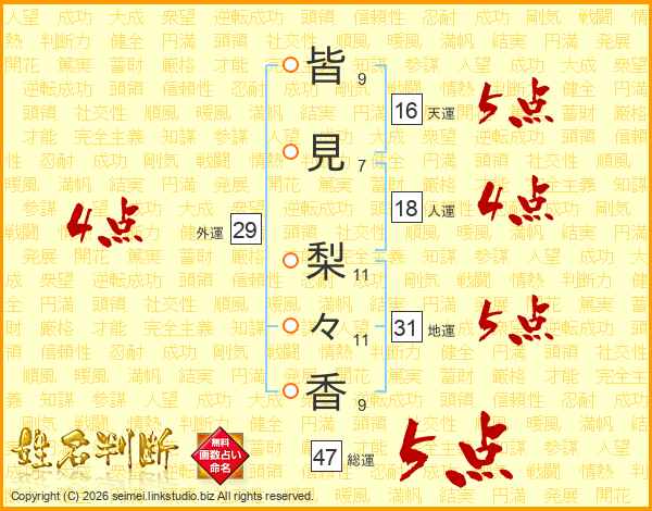 皆(9画)見(7画) 梨(11画)々(11画)香(9画)