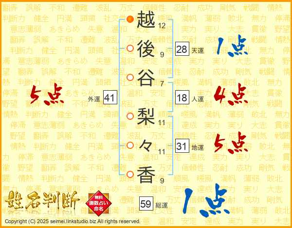 越(12画)後(9画)谷(7画) 梨(11画)々(11画)香(9画)