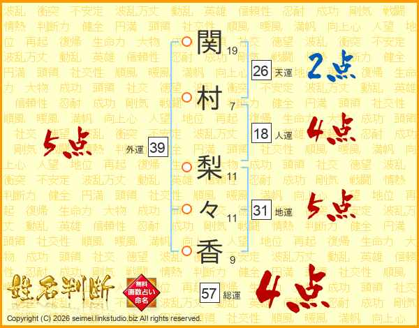 関(19画)村(7画) 梨(11画)々(11画)香(9画)