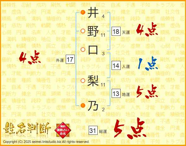 井(4画)野(11画)口(3画) 梨(11画)乃(2画)