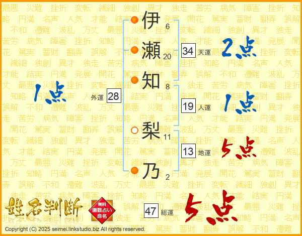 伊(6画)瀬(20画)知(8画) 梨(11画)乃(2画)