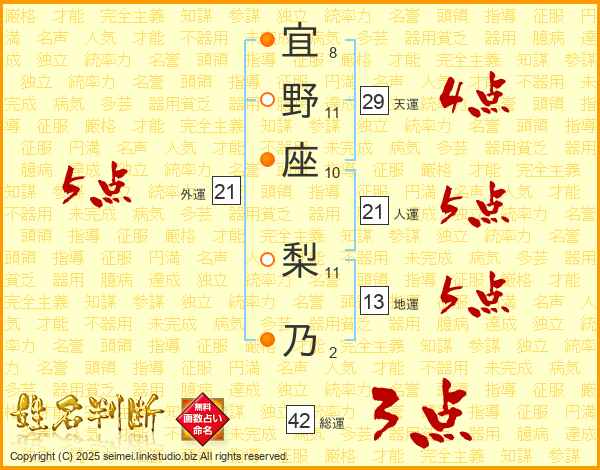 宜(8画)野(11画)座(10画) 梨(11画)乃(2画)