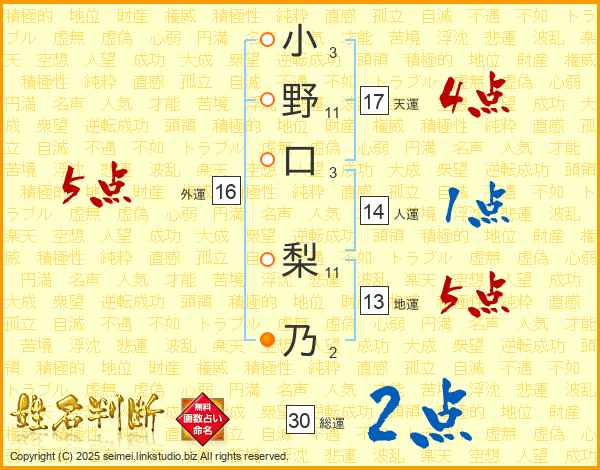 小(3画)野(11画)口(3画) 梨(11画)乃(2画)