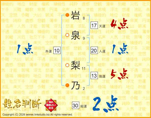 岩(8画)泉(9画) 梨(11画)乃(2画)