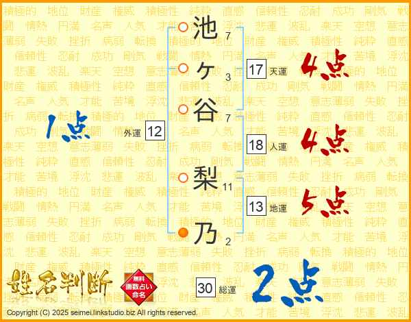 池(7画)ヶ(3画)谷(7画) 梨(11画)乃(2画)