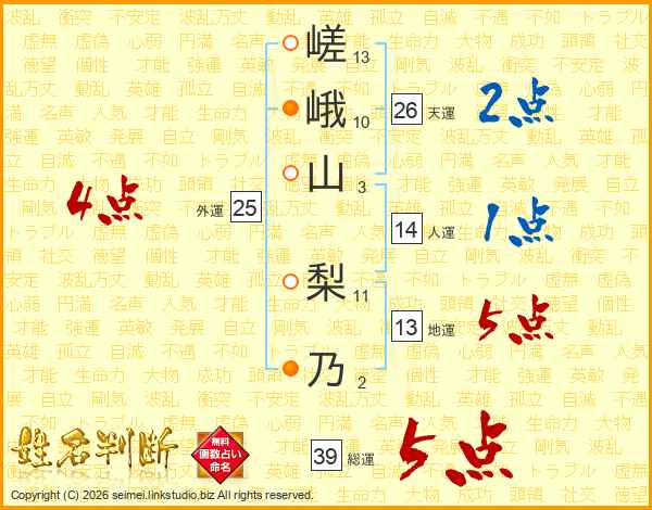 嵯峨山梨乃さんの総運は39画の5点!