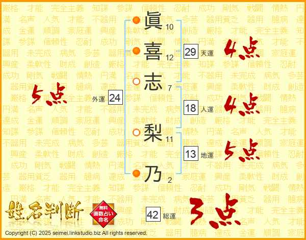 眞(10画)喜(12画)志(7画) 梨(11画)乃(2画)