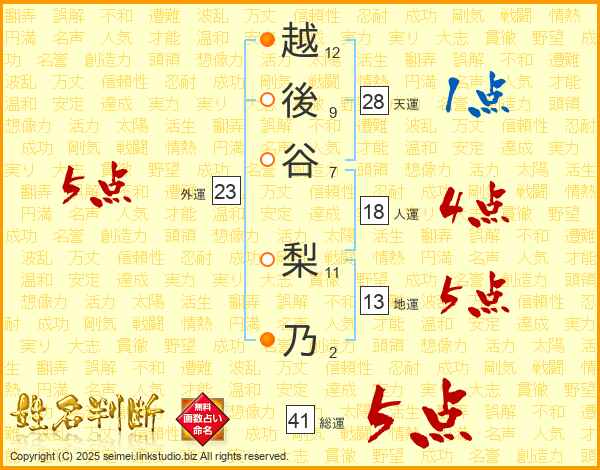 越(12画)後(9画)谷(7画) 梨(11画)乃(2画)