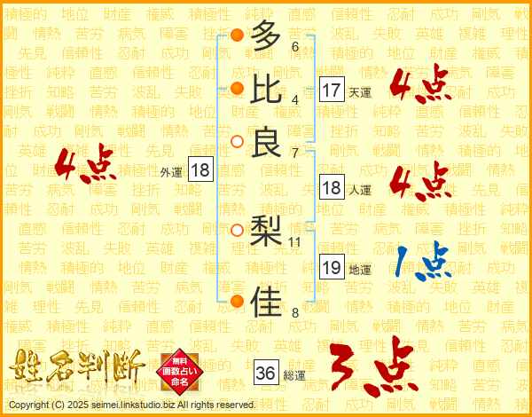多(6画)比(4画)良(7画) 梨(11画)佳(8画)