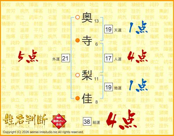 奥(13画)寺(6画) 梨(11画)佳(8画)