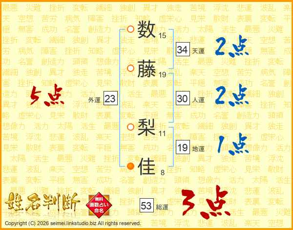 数(15画)藤(19画) 梨(11画)佳(8画)