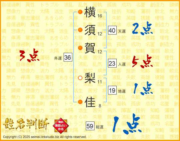 横(16画)須(12画)賀(12画) 梨(11画)佳(8画)