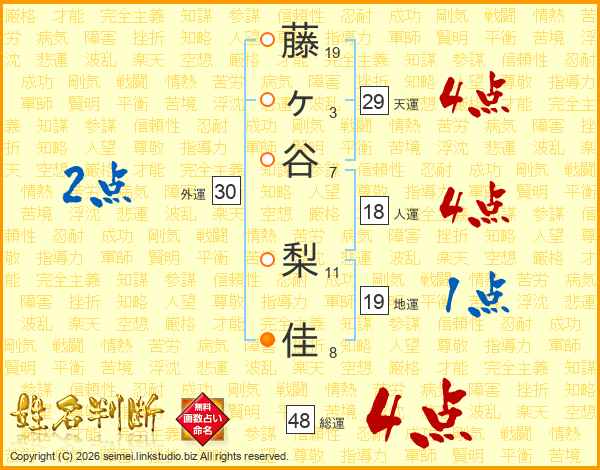 藤(19画)ヶ(3画)谷(7画) 梨(11画)佳(8画)