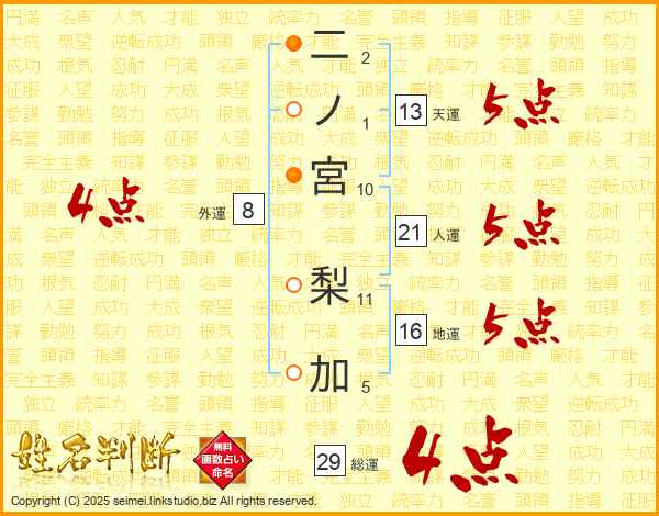 二(2画)ノ(1画)宮(10画) 梨(11画)加(5画)