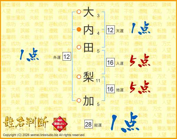 大(3画)内(4画)田(5画) 梨(11画)加(5画)