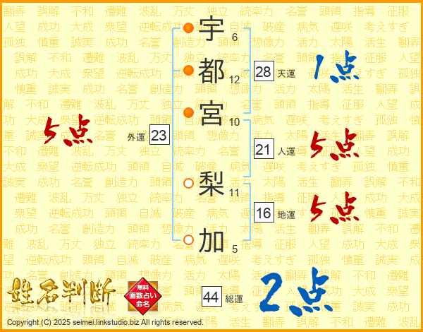 宇(6画)都(12画)宮(10画) 梨(11画)加(5画)